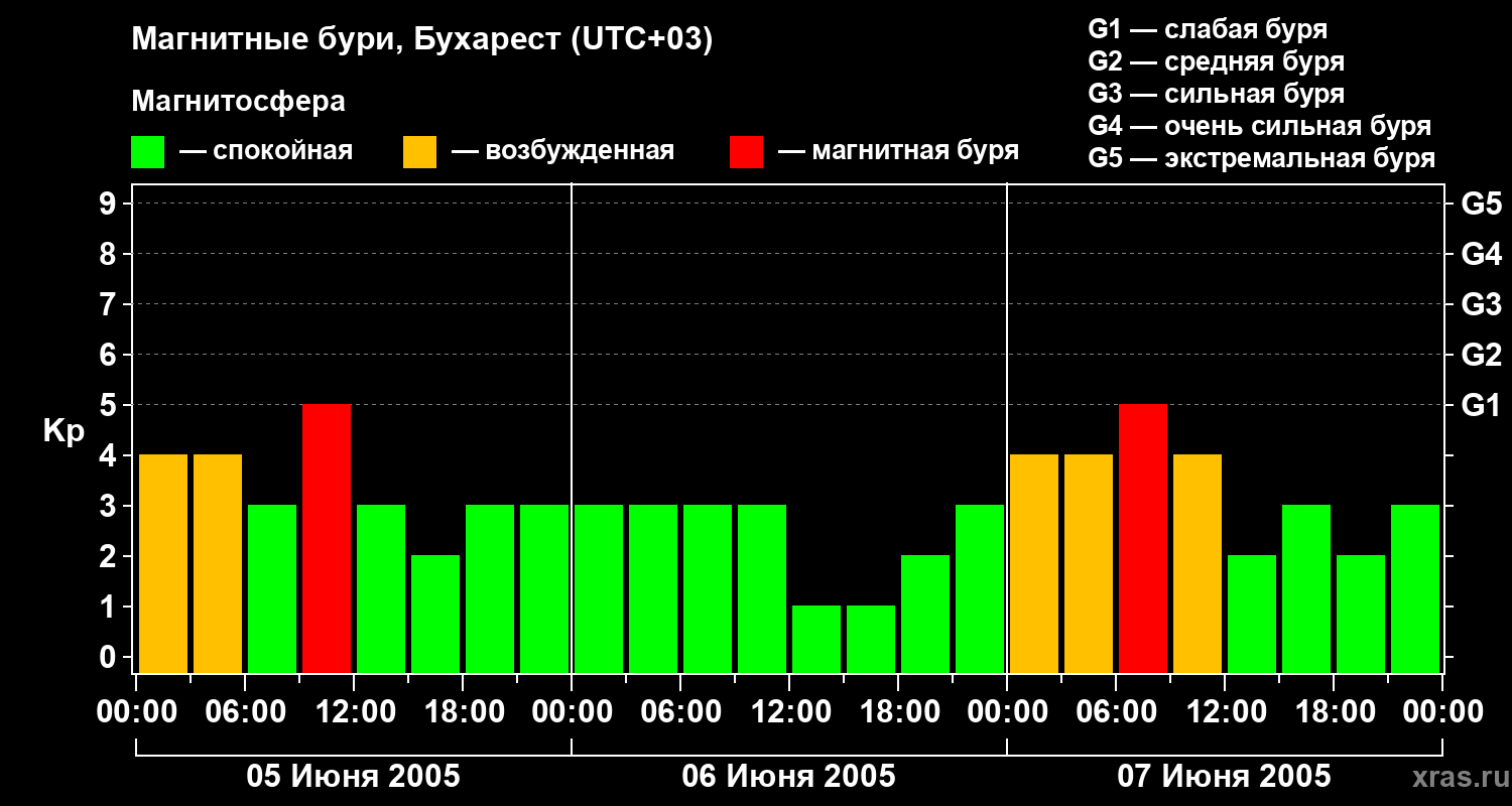 Изменения геомагнитного индекса Kp с 5 по 7 июня 2005 года для средних широт