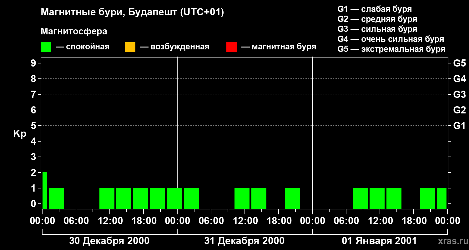 Изменения геомагнитного индекса Kp с 30 декабря 2000 года по 1 января 2001 года для средних широт