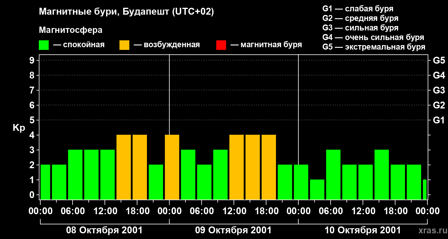 Изменения геомагнитного индекса Kp с 8 по 10 октября 2001 года для средних широт