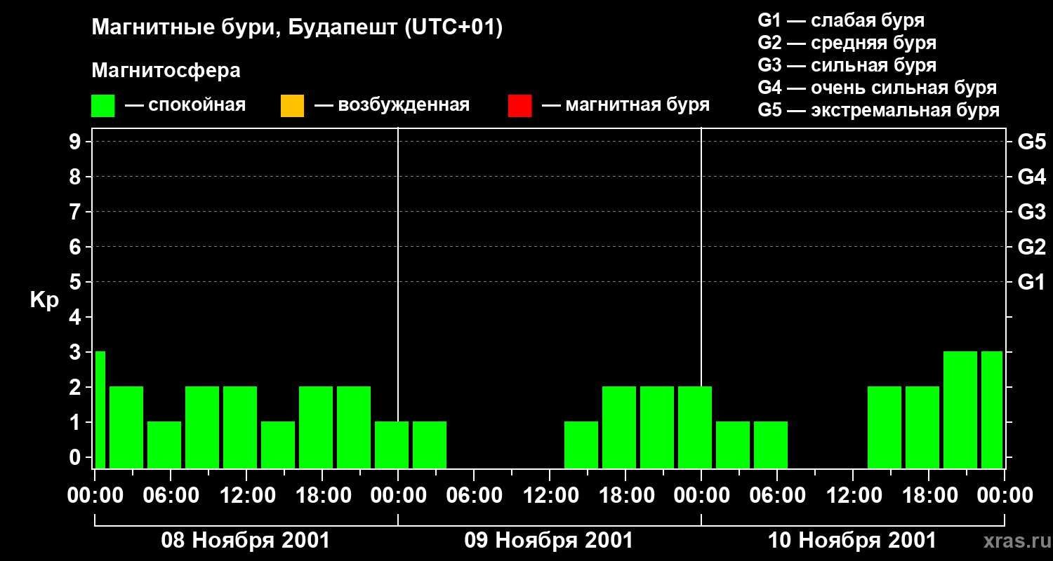 Изменения геомагнитного индекса Kp с 8 по 10 ноября 2001 года для средних широт