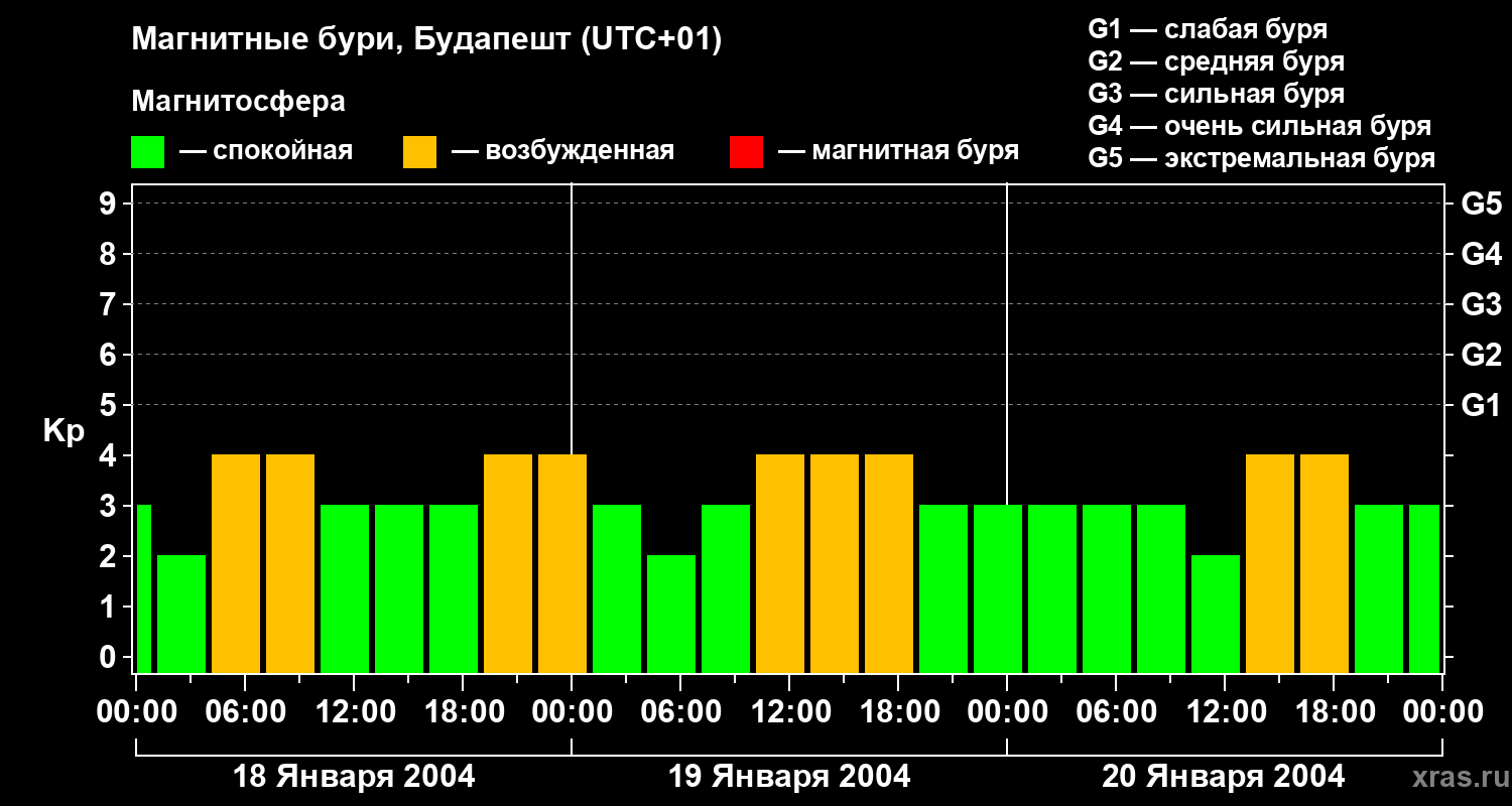 Изменения геомагнитного индекса Kp с 18 по 20 января 2004 года для средних широт