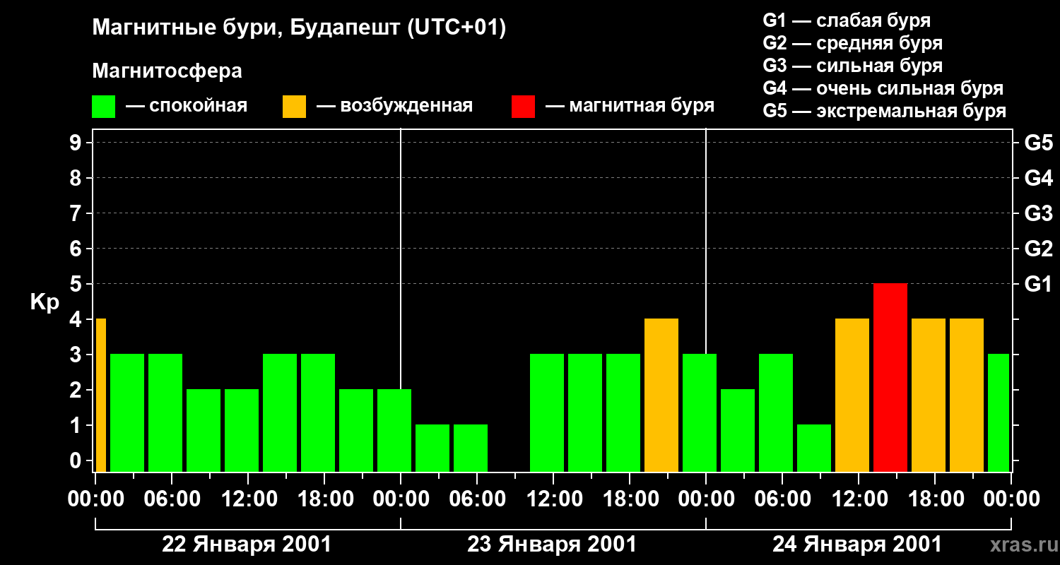 Изменения геомагнитного индекса Kp с 22 по 24 января 2001 года для средних широт