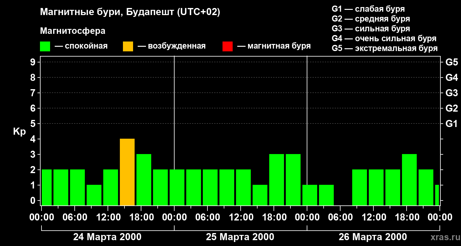 Изменения геомагнитного индекса Kp с 24 по 26 марта 2000 года для средних широт