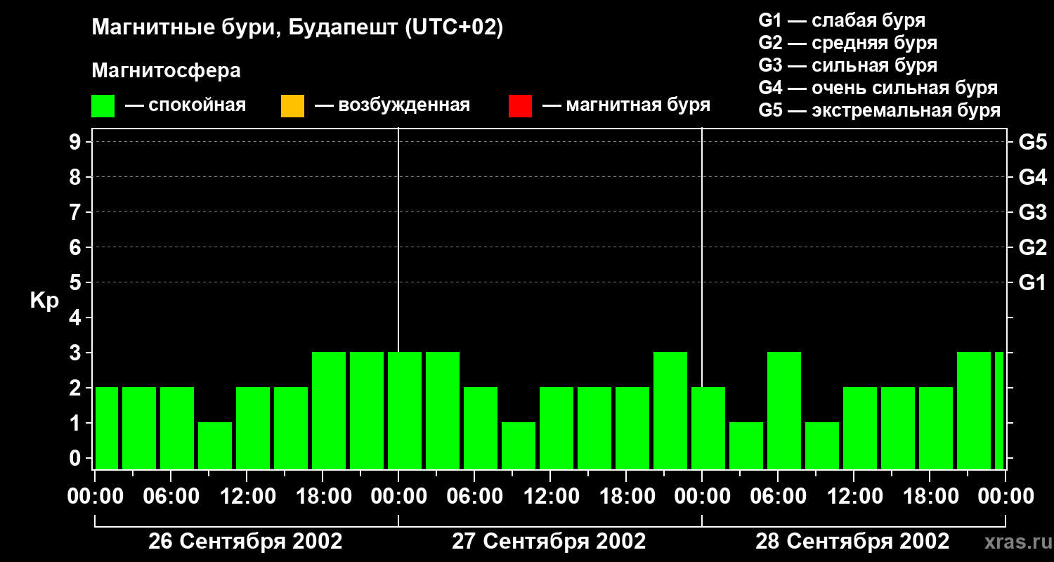 Изменения геомагнитного индекса Kp с 26 по 28 сентября 2002 года для средних широт