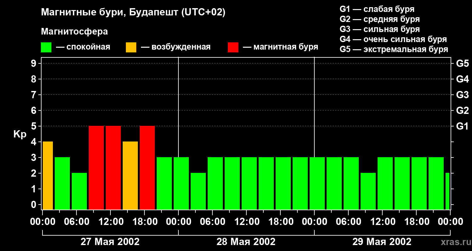 Изменения геомагнитного индекса Kp с 27 по 29 мая 2002 года для средних широт