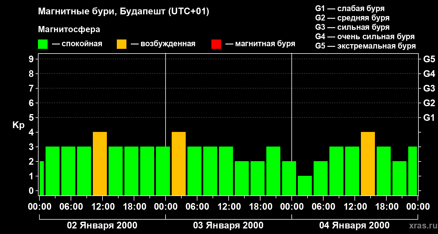 Изменения геомагнитного индекса Kp с 2 по 4 января 2000 года для средних широт