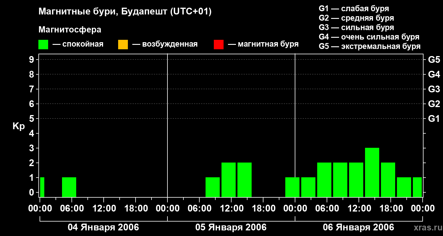 Изменения геомагнитного индекса Kp с 4 по 6 января 2006 года для средних широт