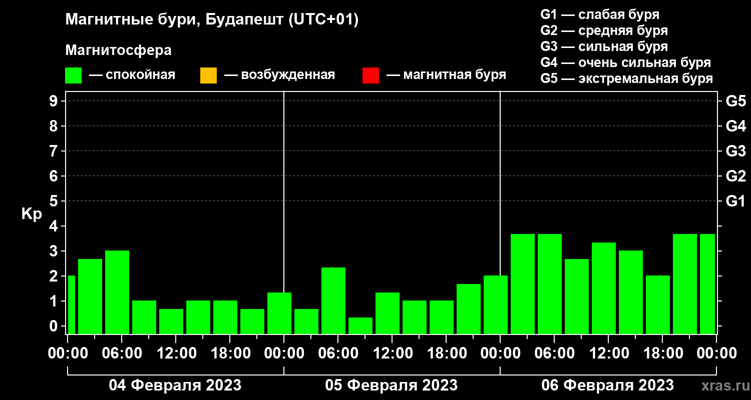 Изменения геомагнитного индекса Kp с 4 по 6 февраля 2023 года для средних широт