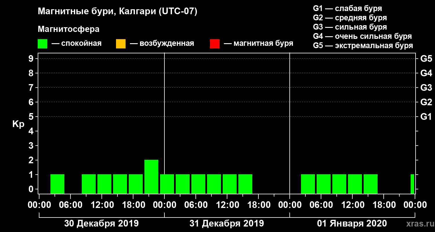 Изменения геомагнитного индекса Kp с 30 декабря 2019 года по 1 января 2020 года для средних широт