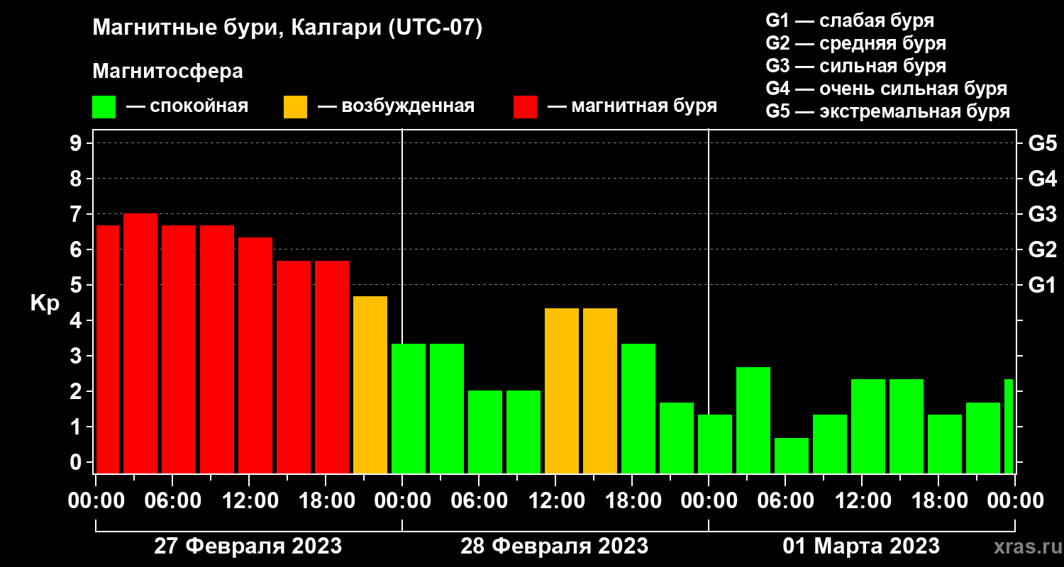 Изменения геомагнитного индекса Kp с 27 февраля по 1 марта 2023 года для средних широт