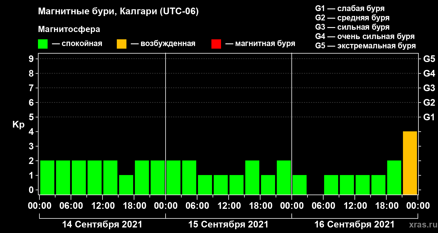 Изменения геомагнитного индекса Kp с 14 по 16 сентября 2021 года для средних широт
