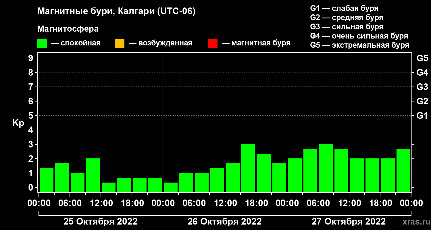 Изменения геомагнитного индекса Kp с 25 по 27 октября 2022 года для средних широт