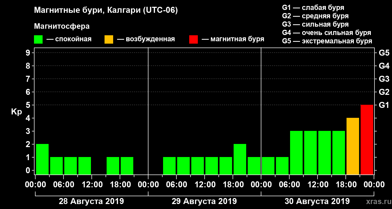 Изменения геомагнитного индекса Kp с 28 по 30 августа 2019 года для средних широт