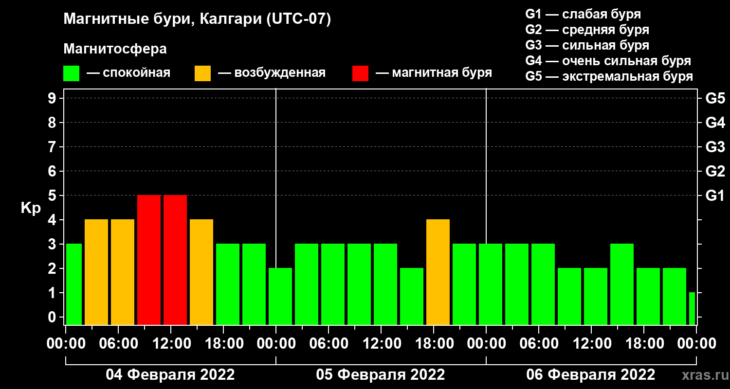 Изменения геомагнитного индекса Kp с 4 по 6 февраля 2022 года для средних широт