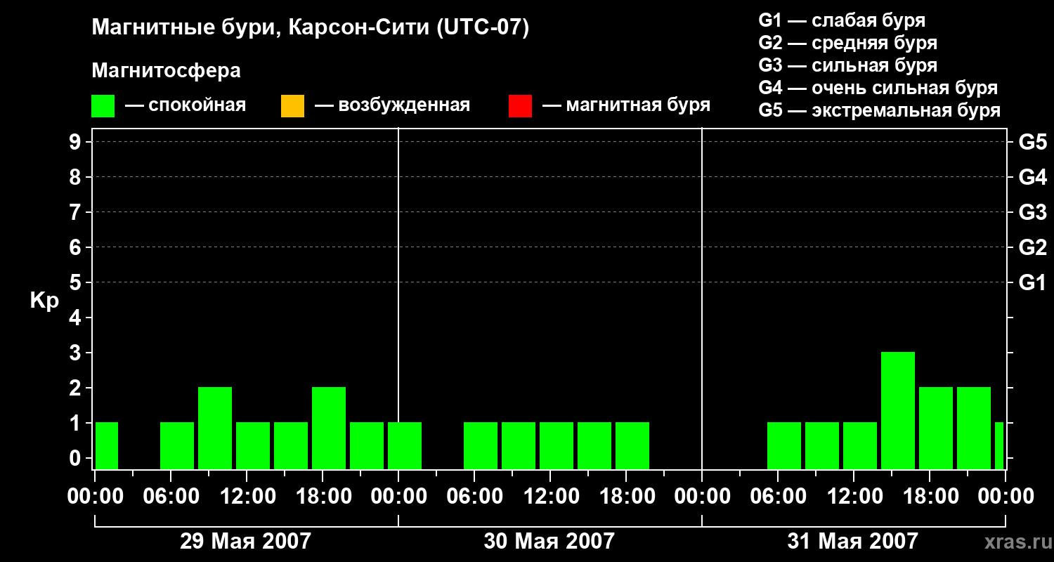 Изменения геомагнитного индекса Kp с 29 по 31 мая 2007 года для средних широт