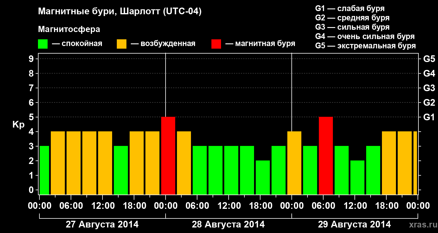 Изменения геомагнитного индекса Kp с 27 по 29 августа 2014 года для средних широт