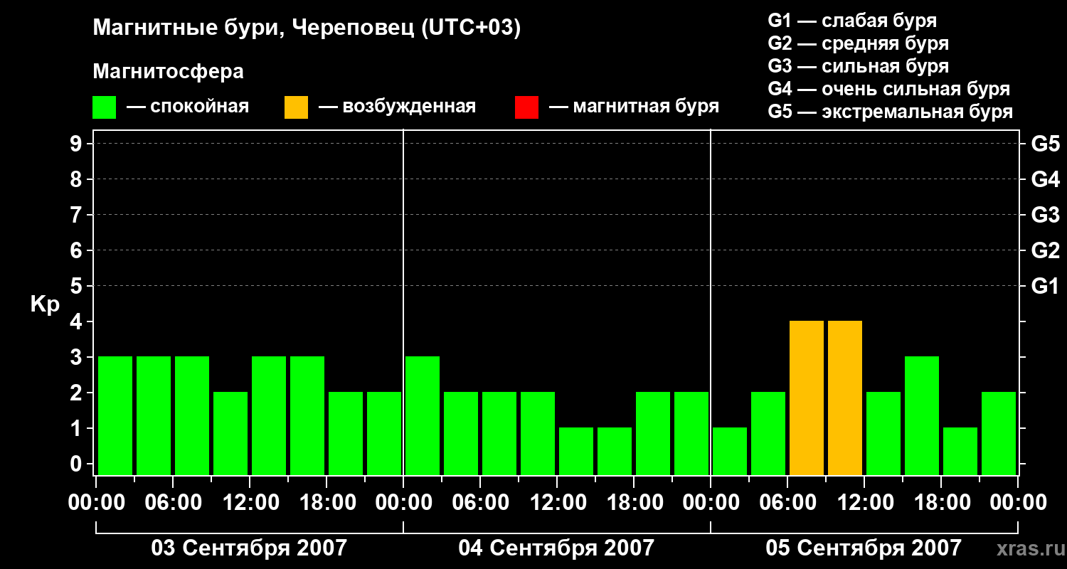 Изменения геомагнитного индекса Kp с 3 по 5 сентября 2007 года для средних широт