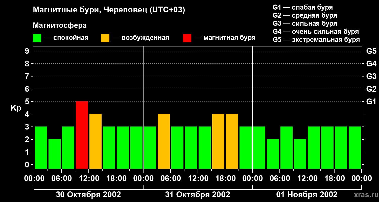 Изменения геомагнитного индекса Kp с 30 октября по 1 ноября 2002 года для средних широт