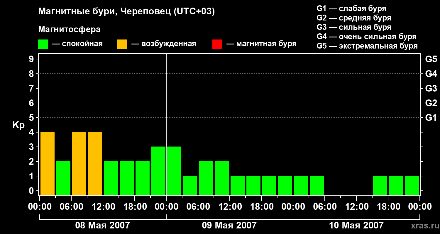 Изменения геомагнитного индекса Kp с 8 по 10 мая 2007 года для средних широт