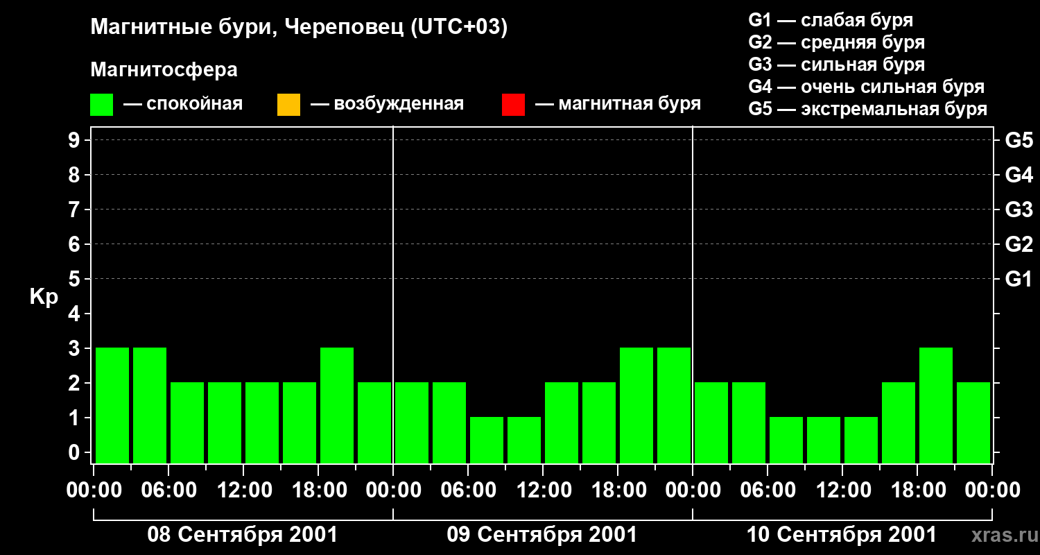 Изменения геомагнитного индекса Kp с 8 по 10 сентября 2001 года для средних широт