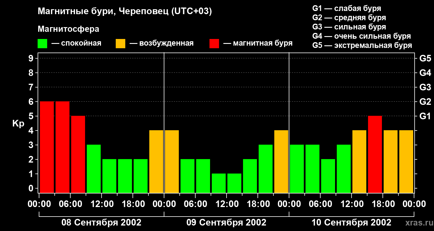 Изменения геомагнитного индекса Kp с 8 по 10 сентября 2002 года для средних широт