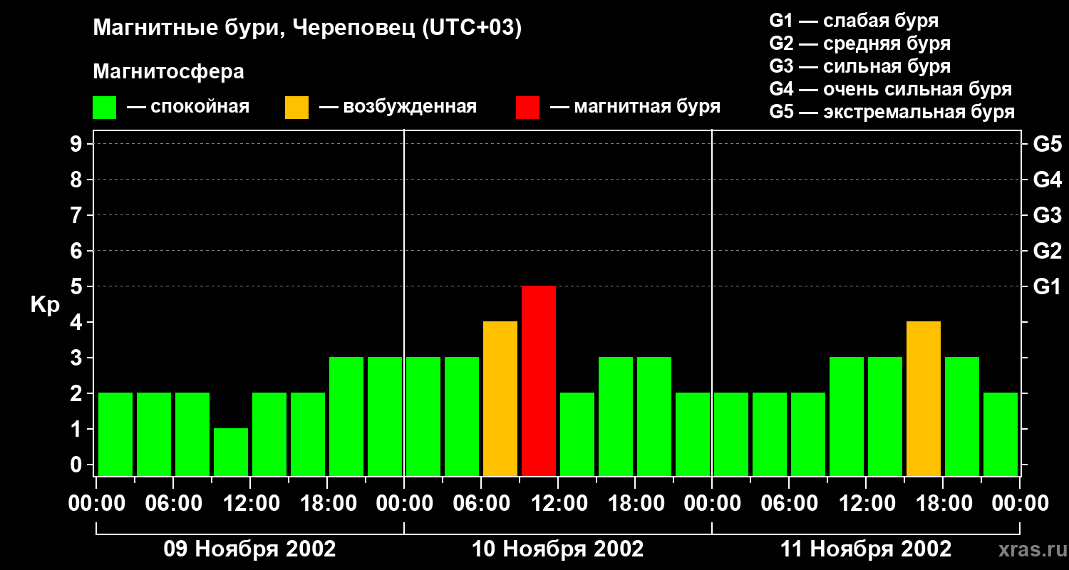 Изменения геомагнитного индекса Kp с 9 по 11 ноября 2002 года для средних широт