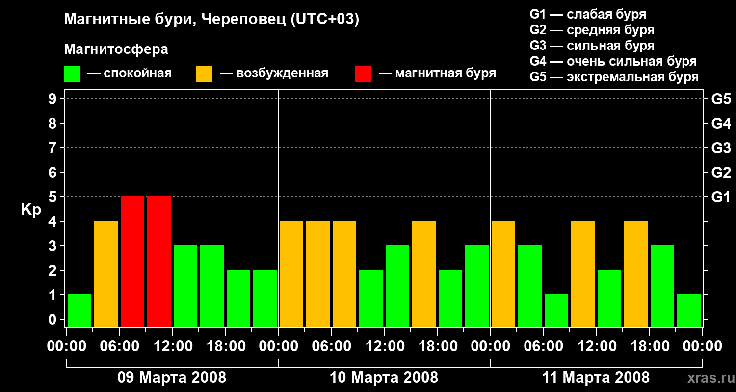Изменения геомагнитного индекса Kp с 9 по 11 марта 2008 года для средних широт
