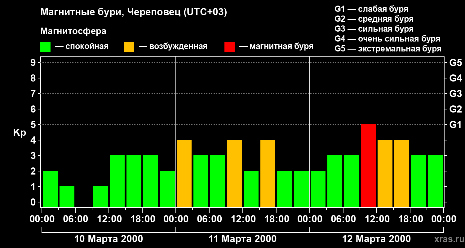 Изменения геомагнитного индекса Kp с 10 по 12 марта 2000 года для средних широт