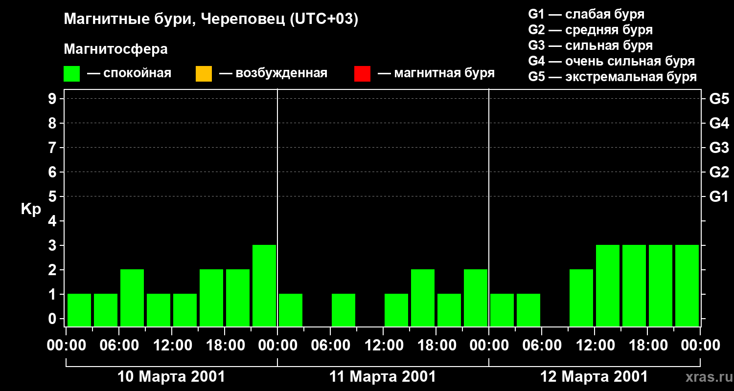Изменения геомагнитного индекса Kp с 10 по 12 марта 2001 года для средних широт