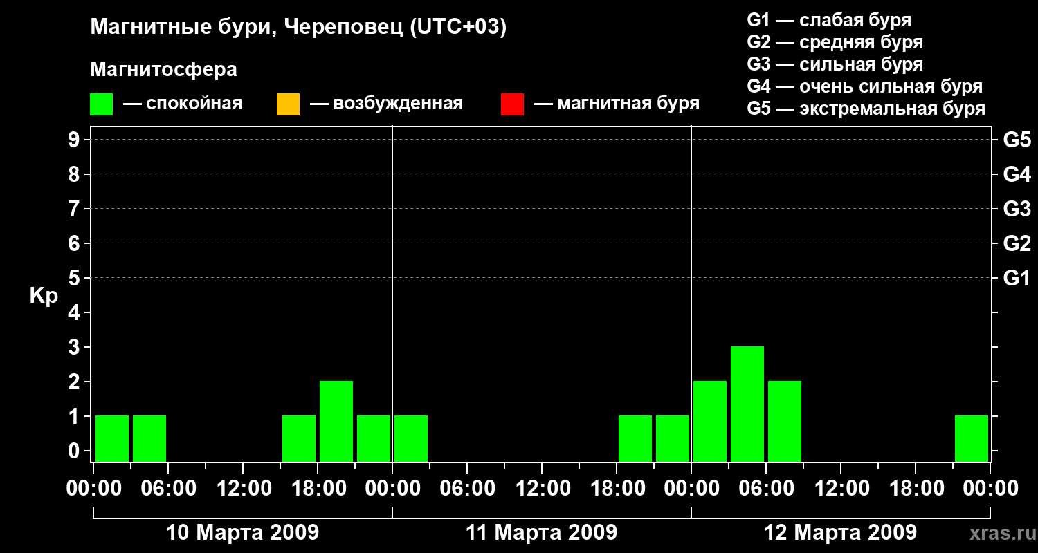 Изменения геомагнитного индекса Kp с 10 по 12 марта 2009 года для средних широт