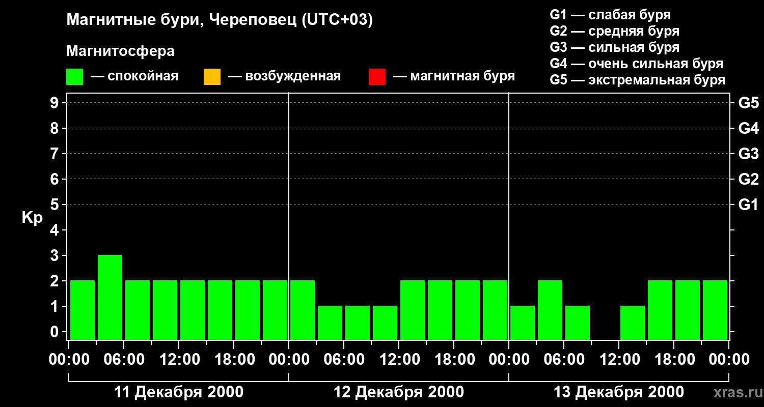 Изменения геомагнитного индекса Kp с 11 по 13 декабря 2000 года для средних широт