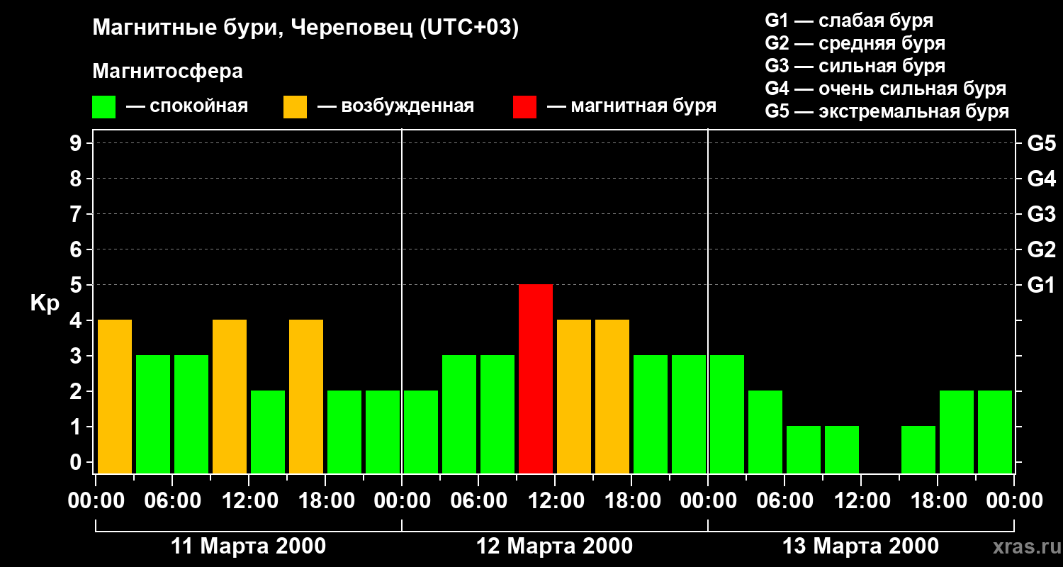 Изменения геомагнитного индекса Kp с 11 по 13 марта 2000 года для средних широт