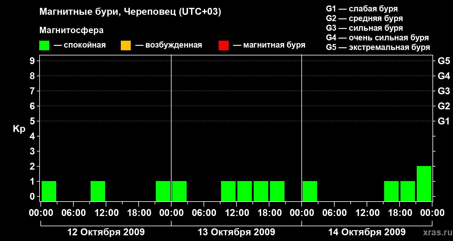 Изменения геомагнитного индекса Kp с 12 по 14 октября 2009 года для средних широт