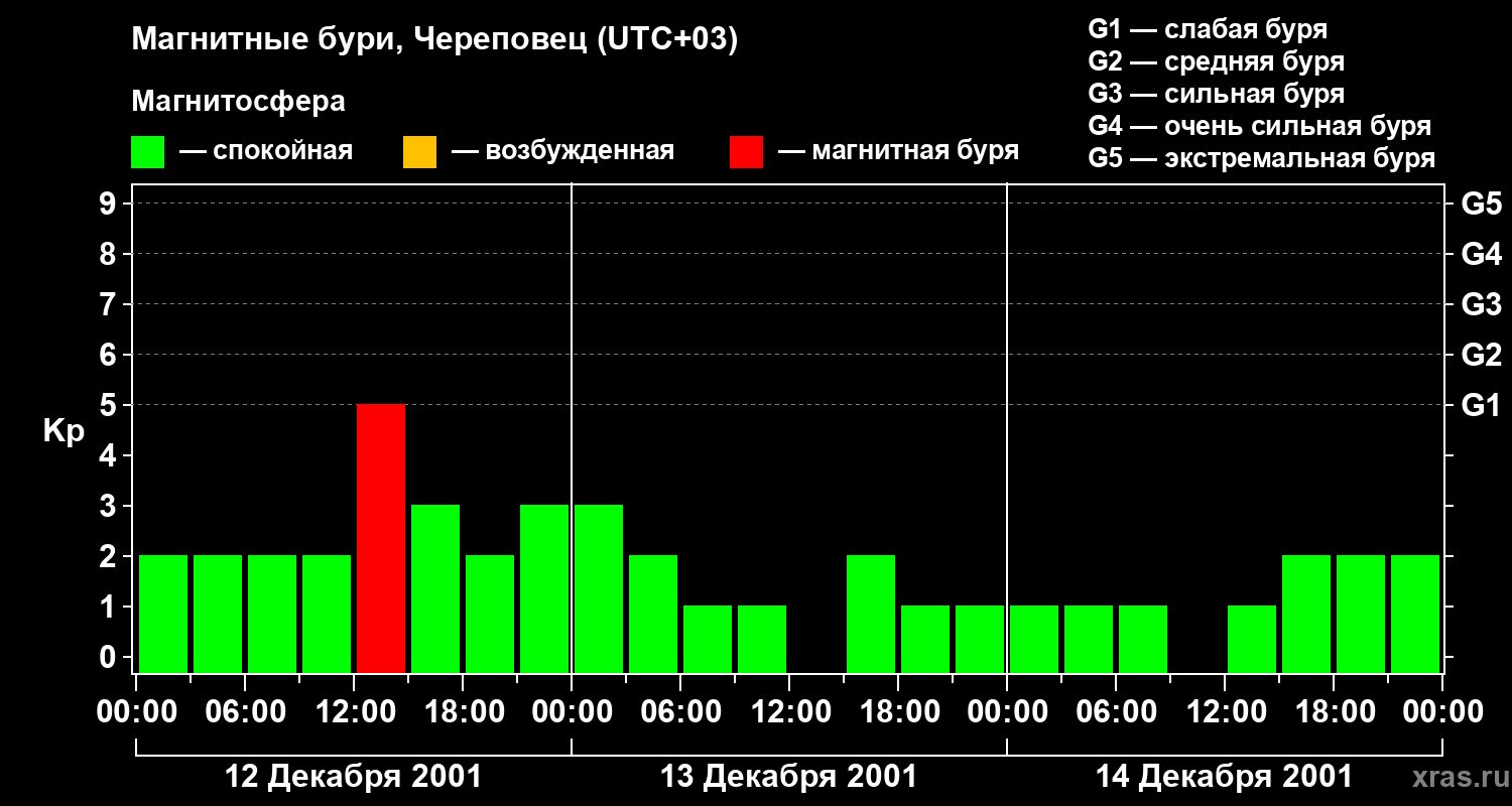 Изменения геомагнитного индекса Kp с 12 по 14 декабря 2001 года для средних широт