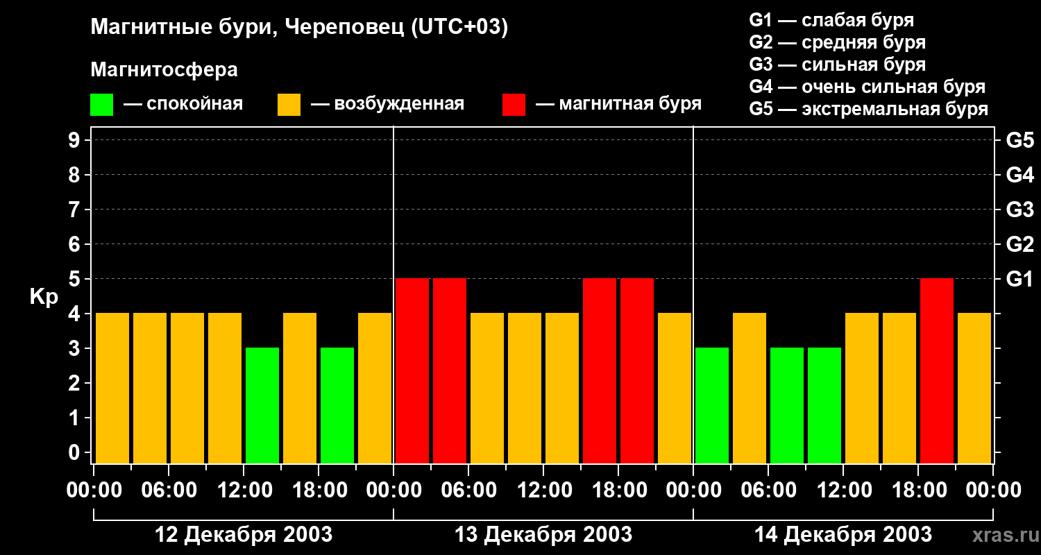 Изменения геомагнитного индекса Kp с 12 по 14 декабря 2003 года для средних широт