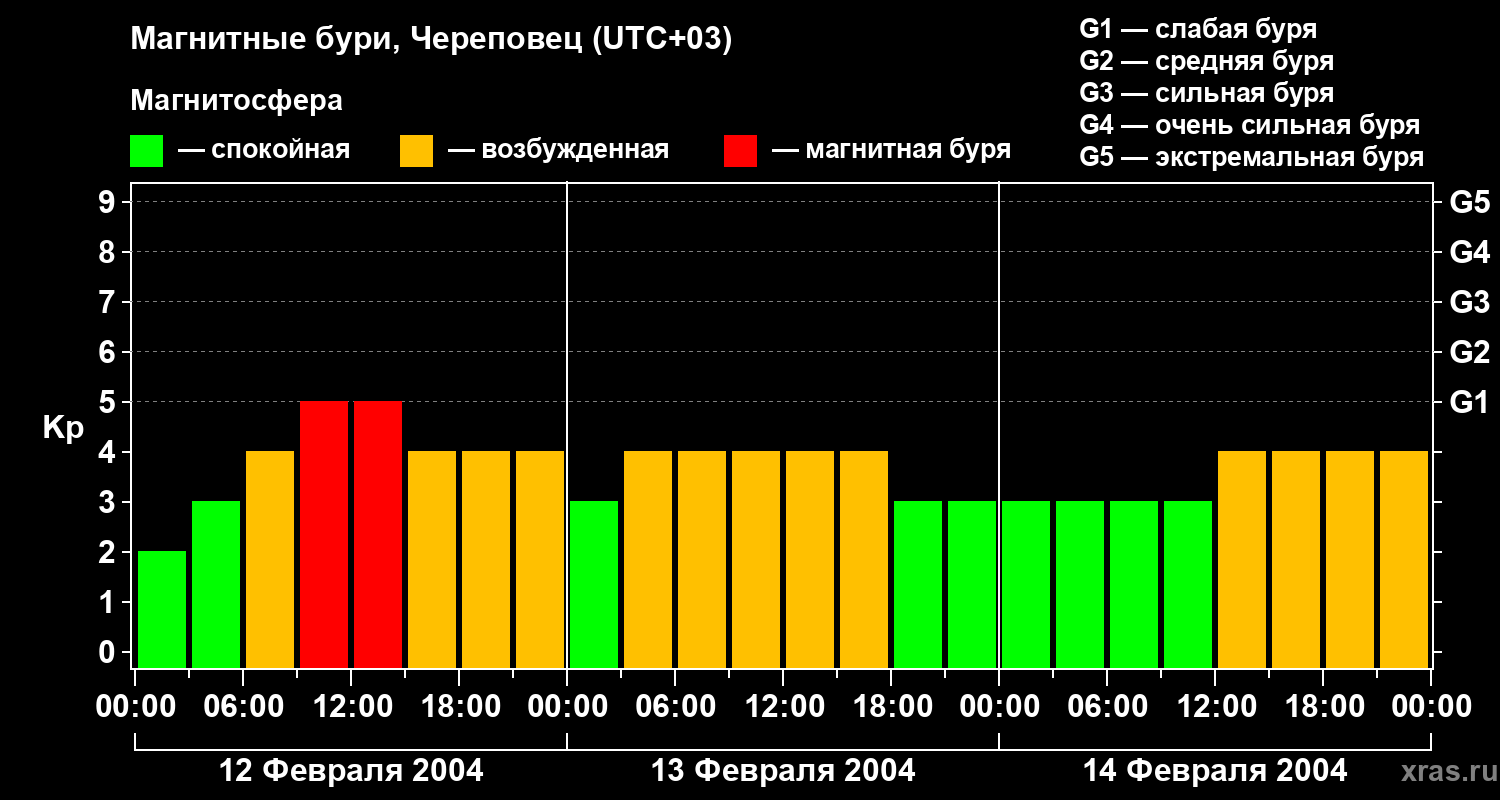Изменения геомагнитного индекса Kp с 12 по 14 февраля 2004 года для средних широт