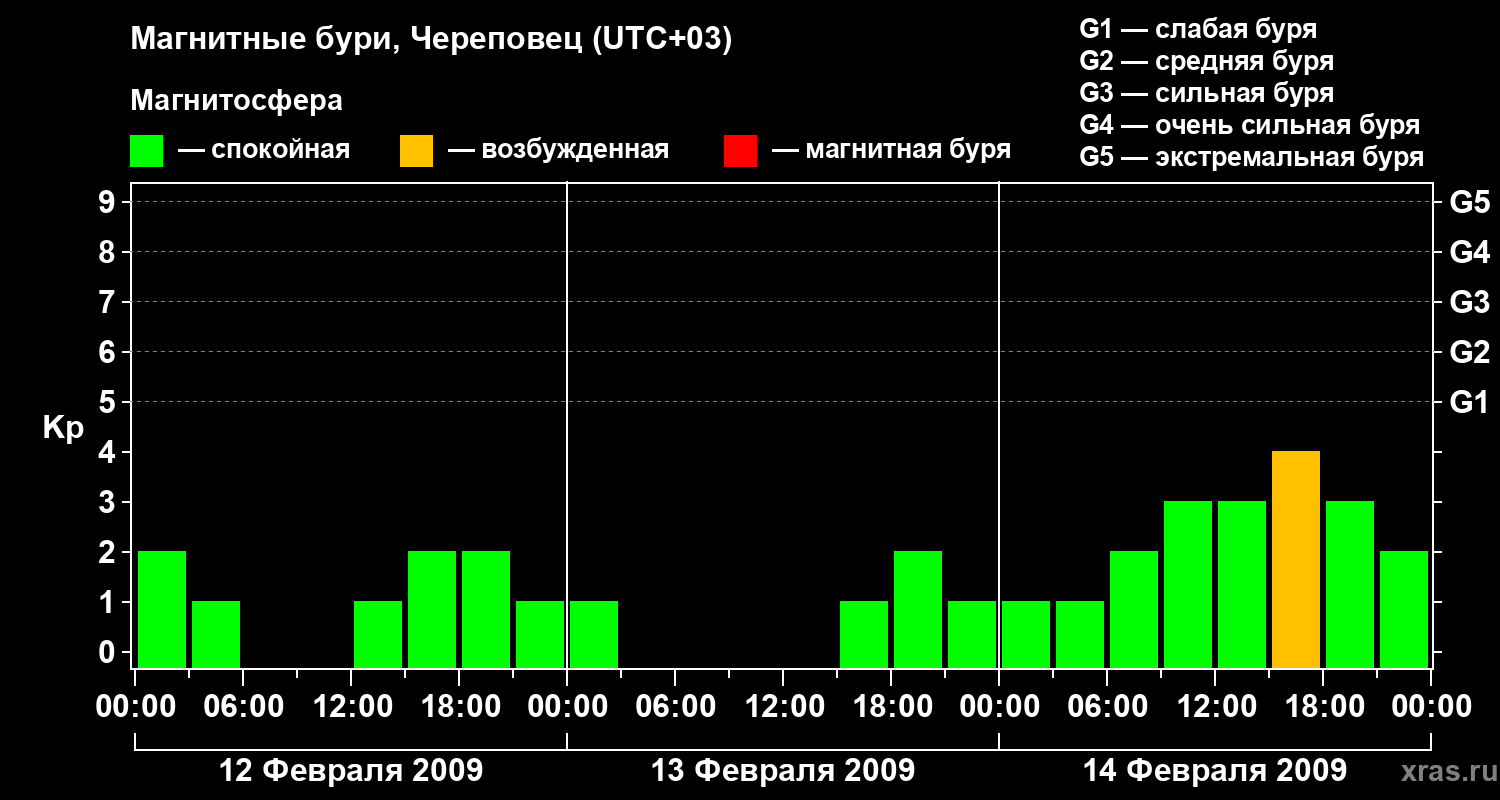 Изменения геомагнитного индекса Kp с 12 по 14 февраля 2009 года для средних широт