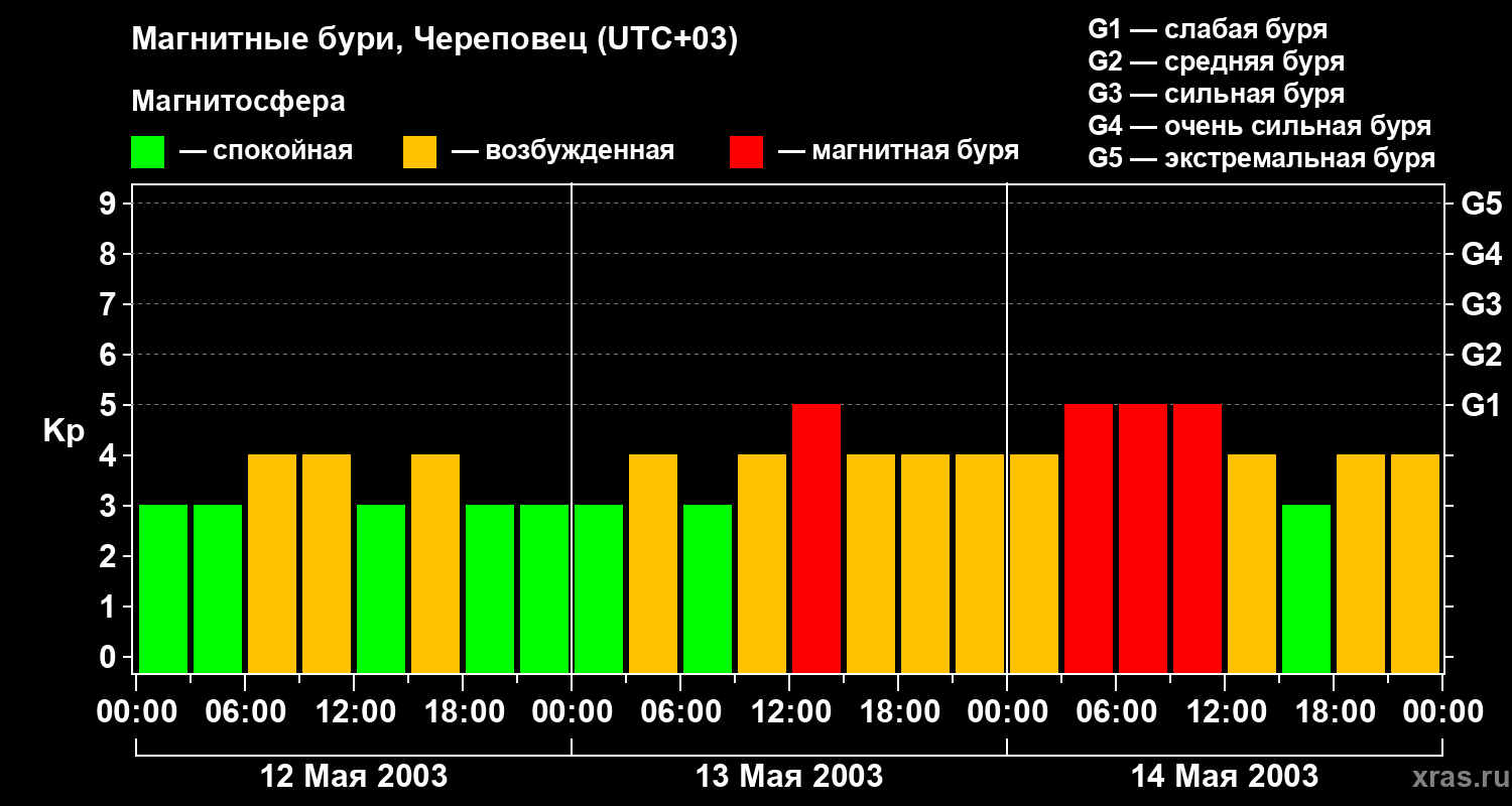 Изменения геомагнитного индекса Kp с 12 по 14 мая 2003 года для средних широт