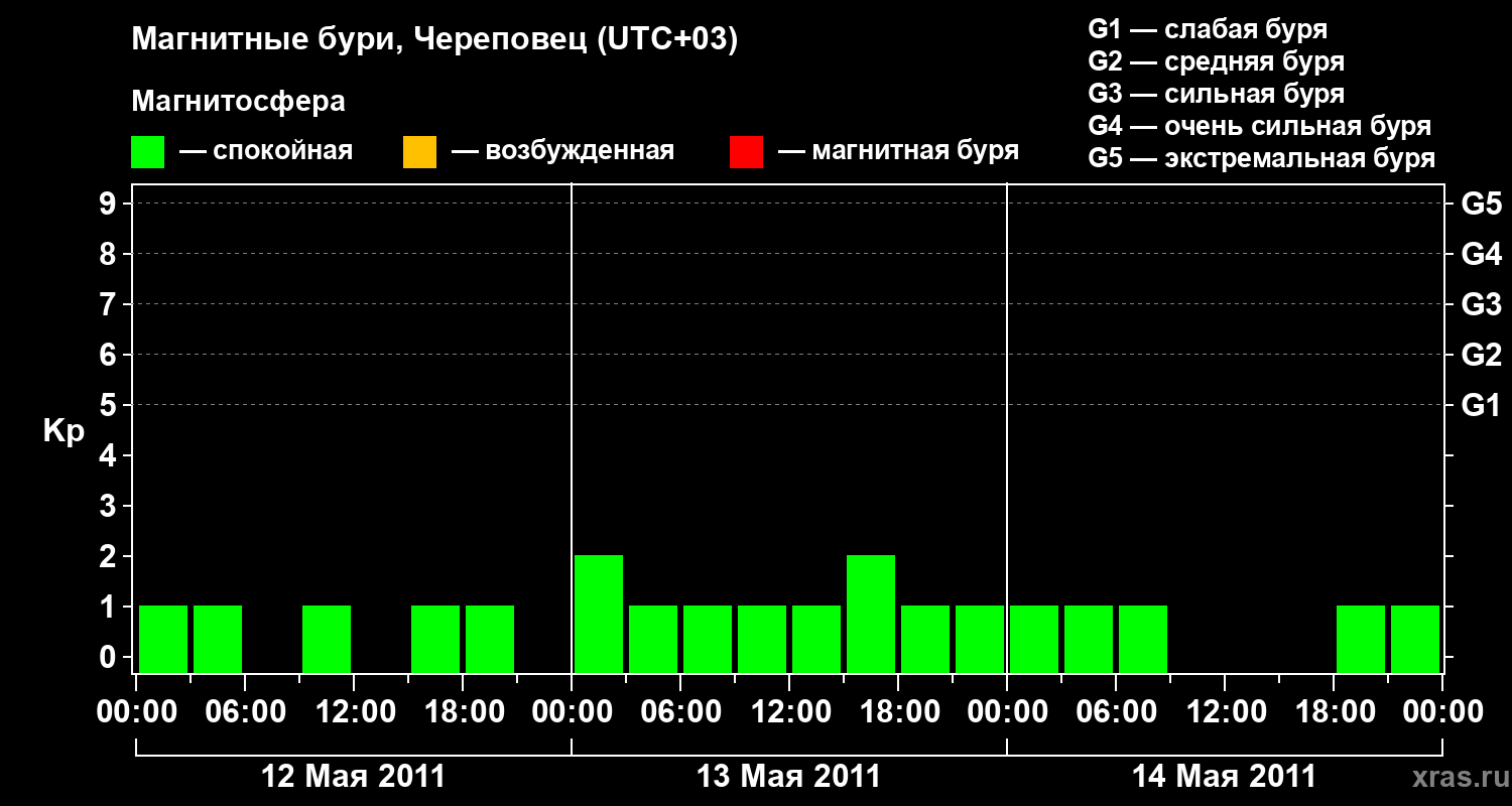 Изменения геомагнитного индекса Kp с 12 по 14 мая 2011 года для средних широт