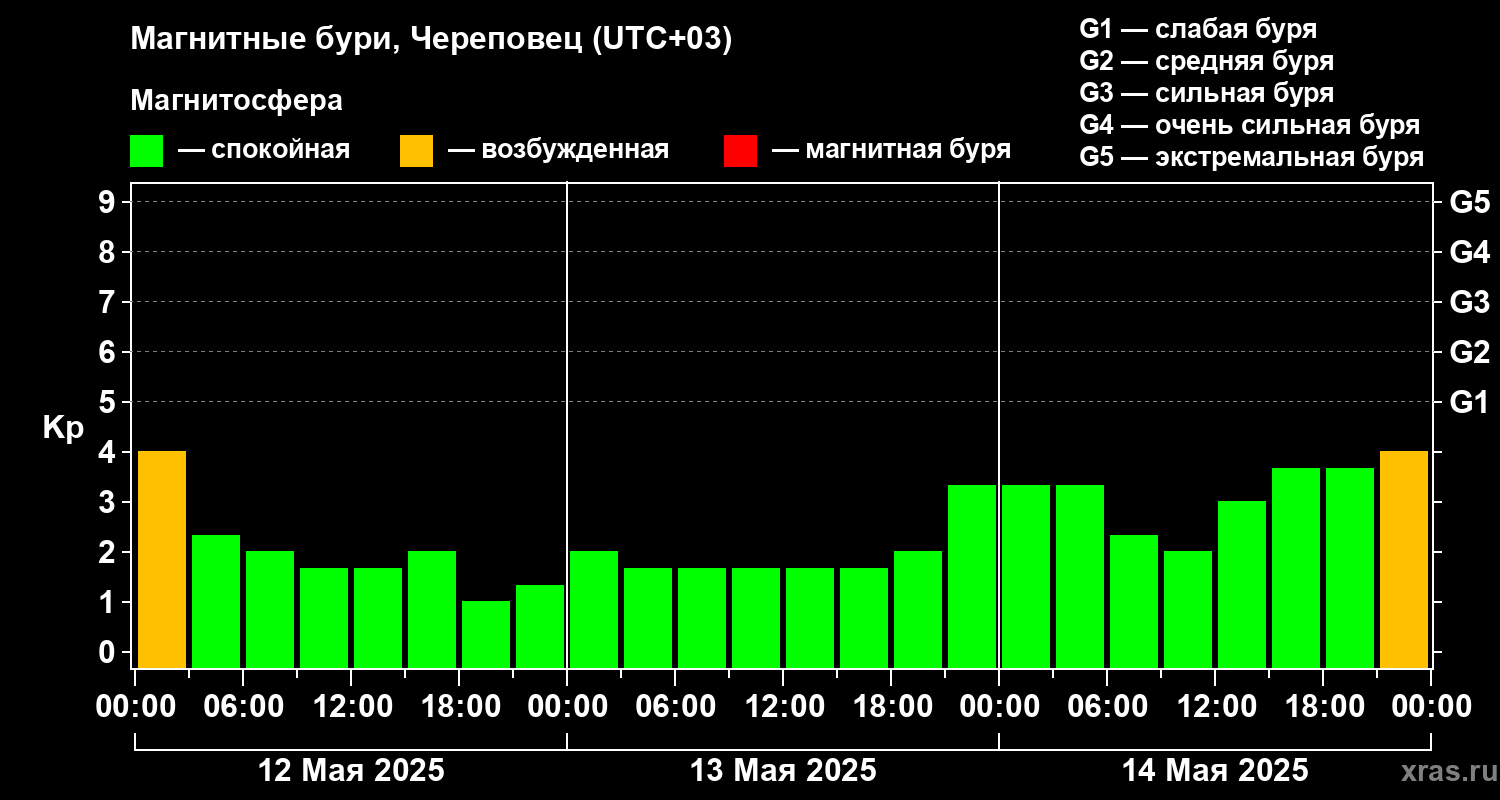 Изменения геомагнитного индекса Kp с 12 по 14 мая 2025 года для средних широт