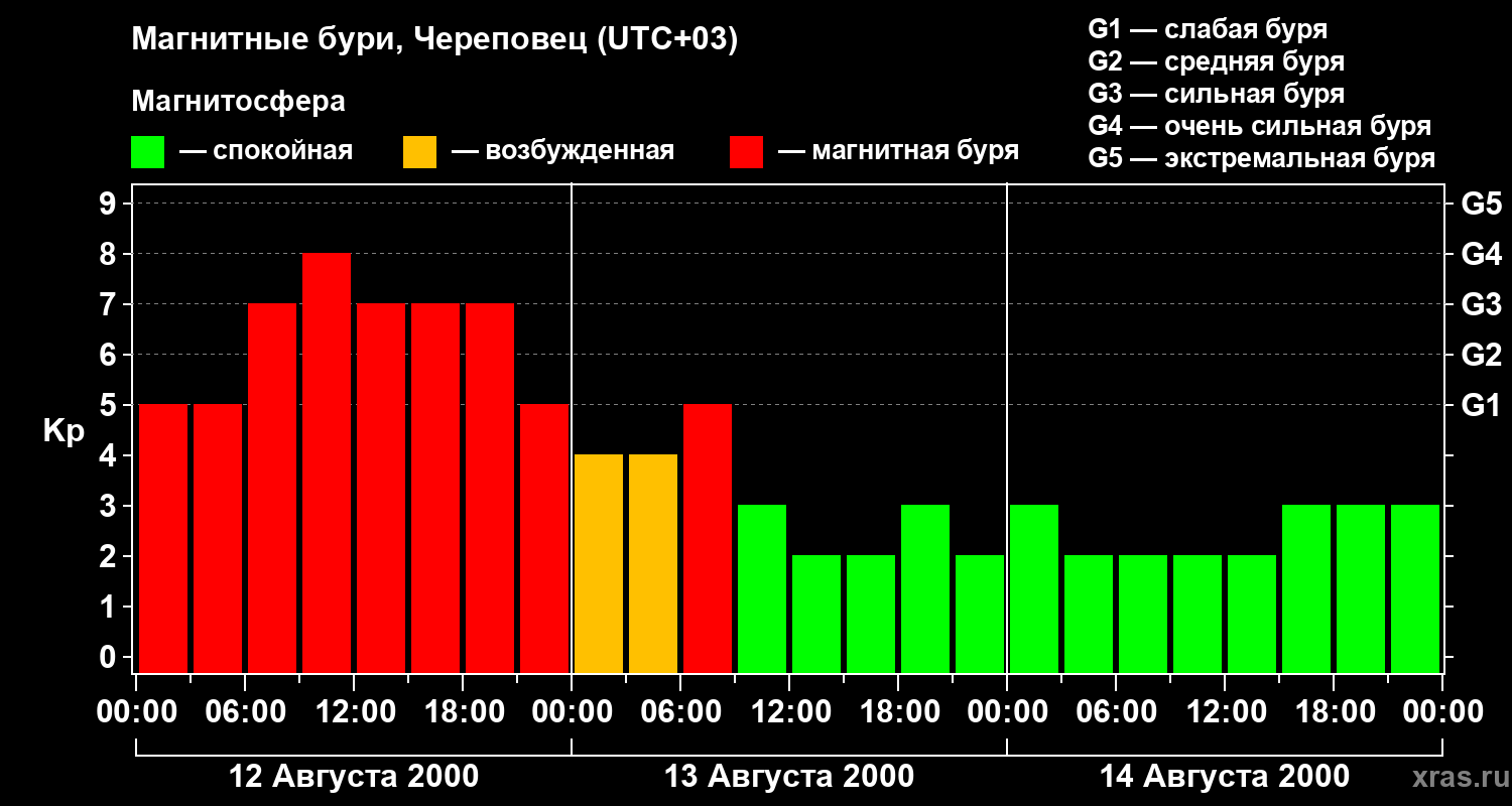Изменения геомагнитного индекса Kp с 12 по 14 августа 2000 года для средних широт