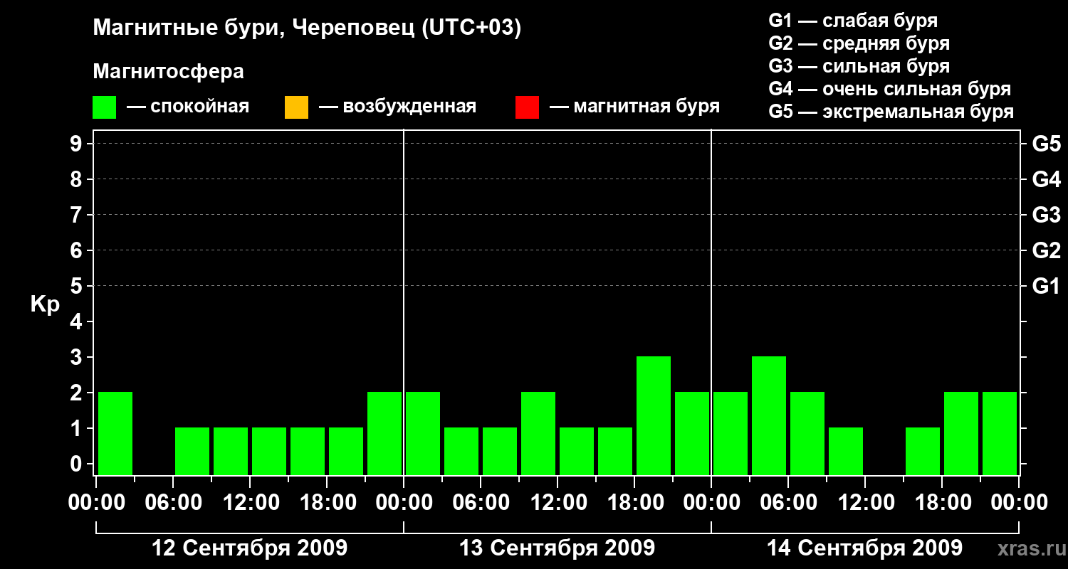 Изменения геомагнитного индекса Kp с 12 по 14 сентября 2009 года для средних широт