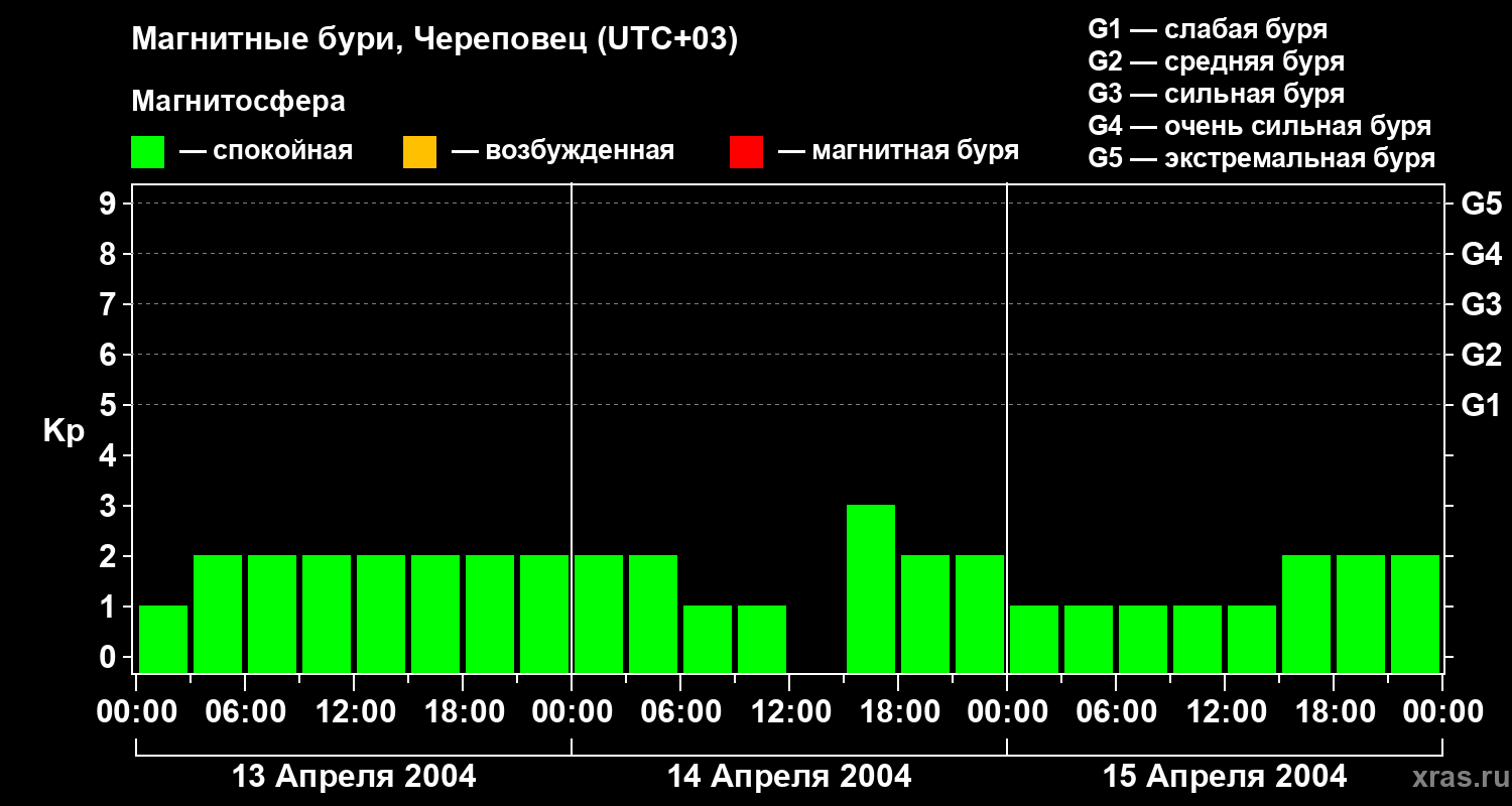 Изменения геомагнитного индекса Kp с 13 по 15 апреля 2004 года для средних широт