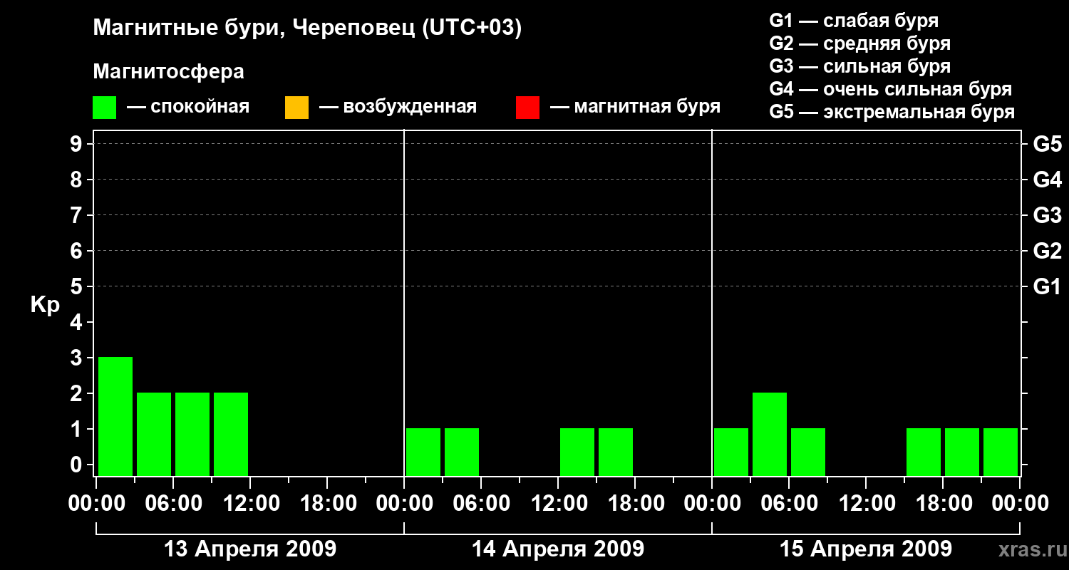 Изменения геомагнитного индекса Kp с 13 по 15 апреля 2009 года для средних широт