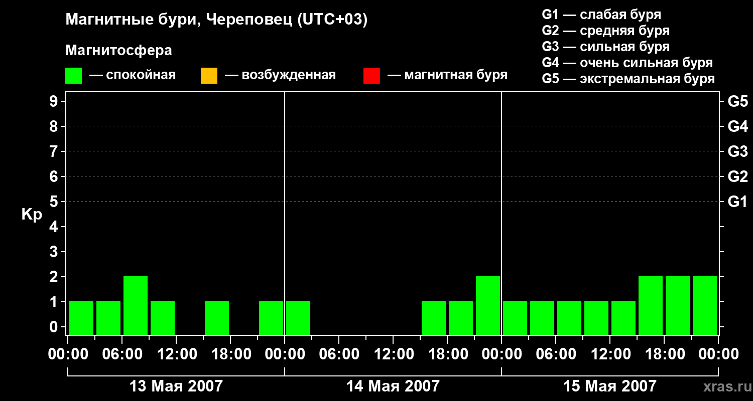 Изменения геомагнитного индекса Kp с 13 по 15 мая 2007 года для средних широт