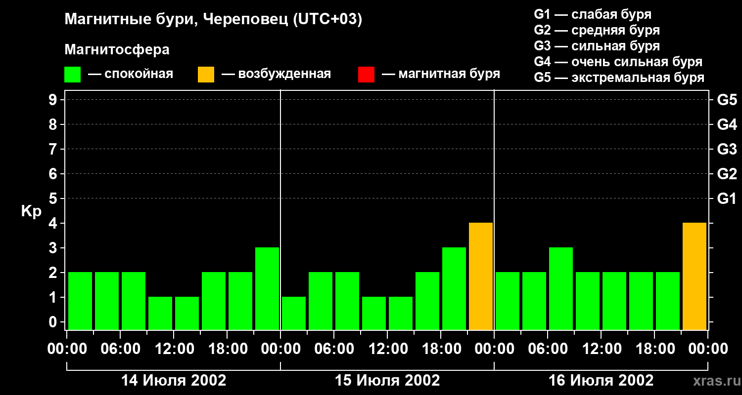 Изменения геомагнитного индекса Kp с 14 по 16 июля 2002 года для средних широт