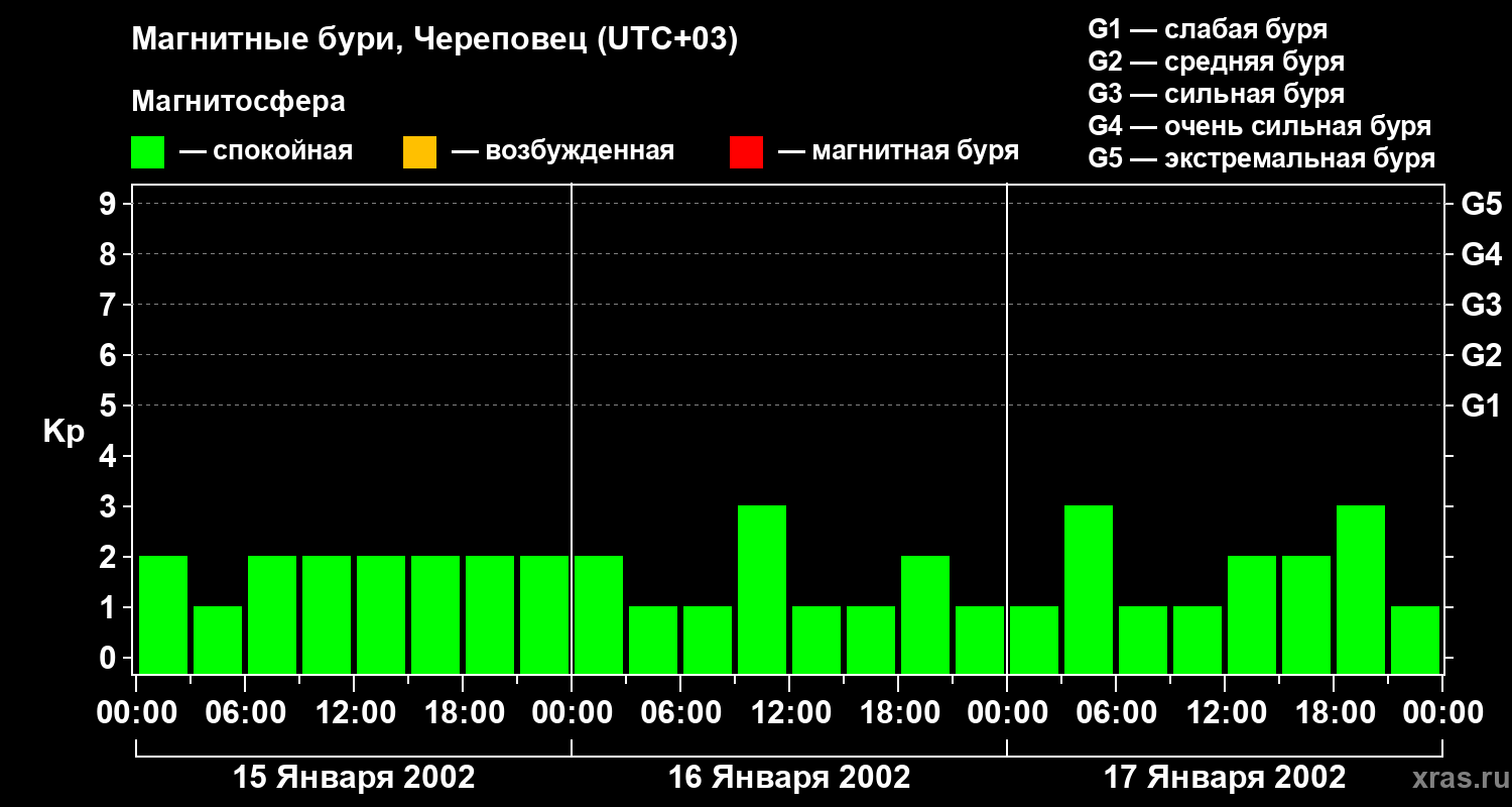 Изменения геомагнитного индекса Kp с 15 по 17 января 2002 года для средних широт