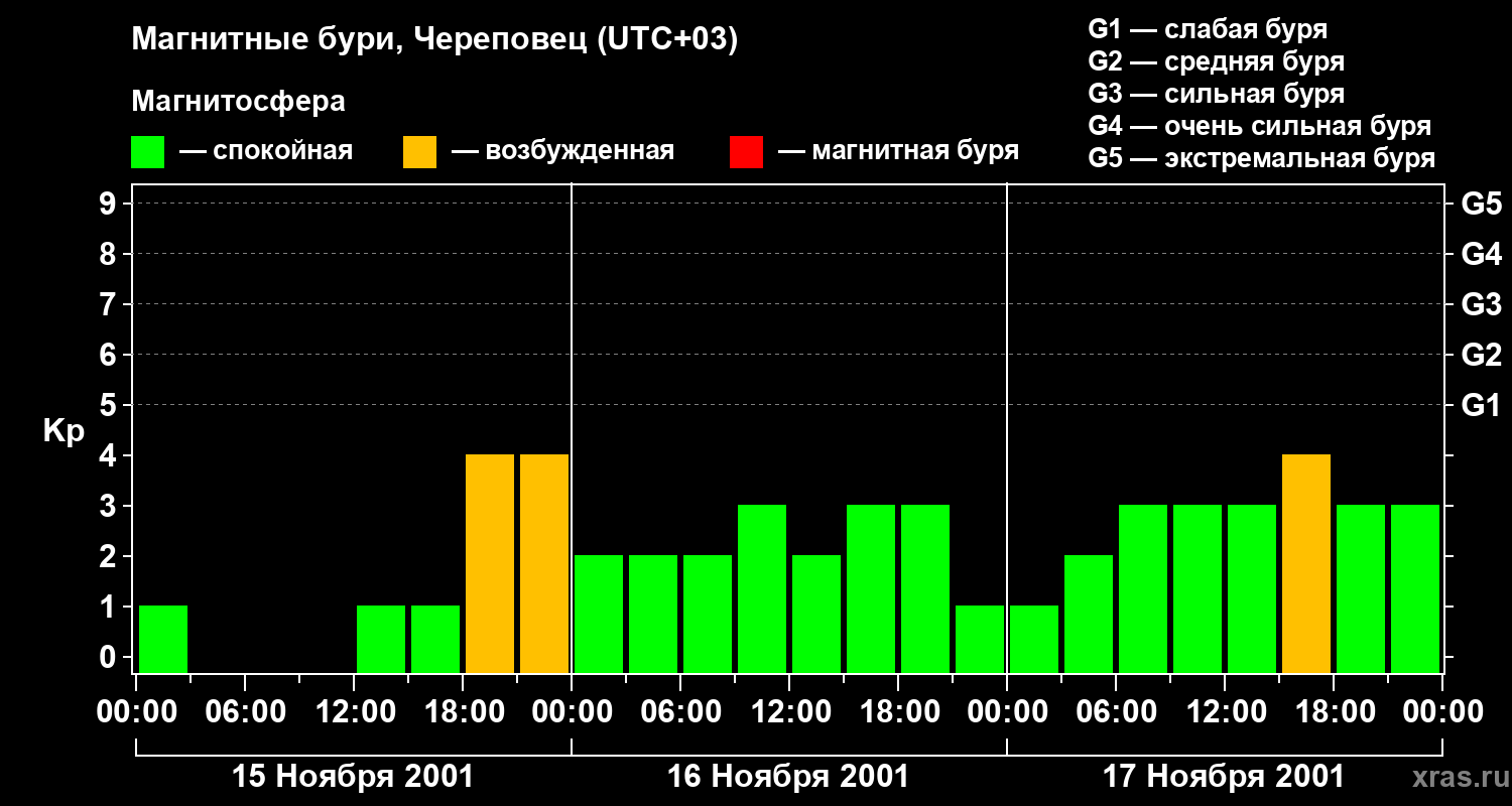 Изменения геомагнитного индекса Kp с 15 по 17 ноября 2001 года для средних широт