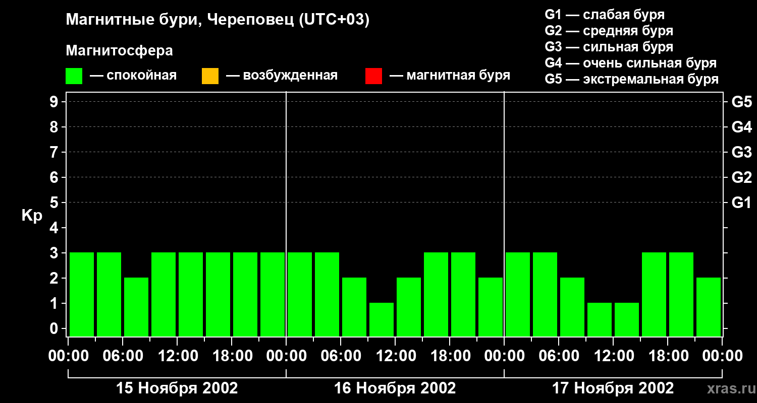 Изменения геомагнитного индекса Kp с 15 по 17 ноября 2002 года для средних широт
