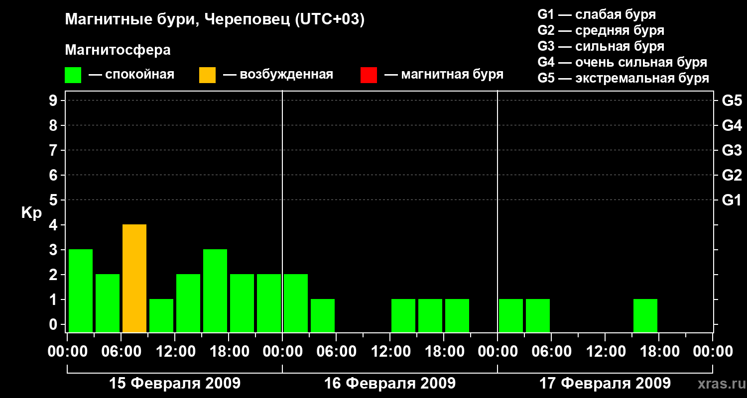Изменения геомагнитного индекса Kp с 15 по 17 февраля 2009 года для средних широт